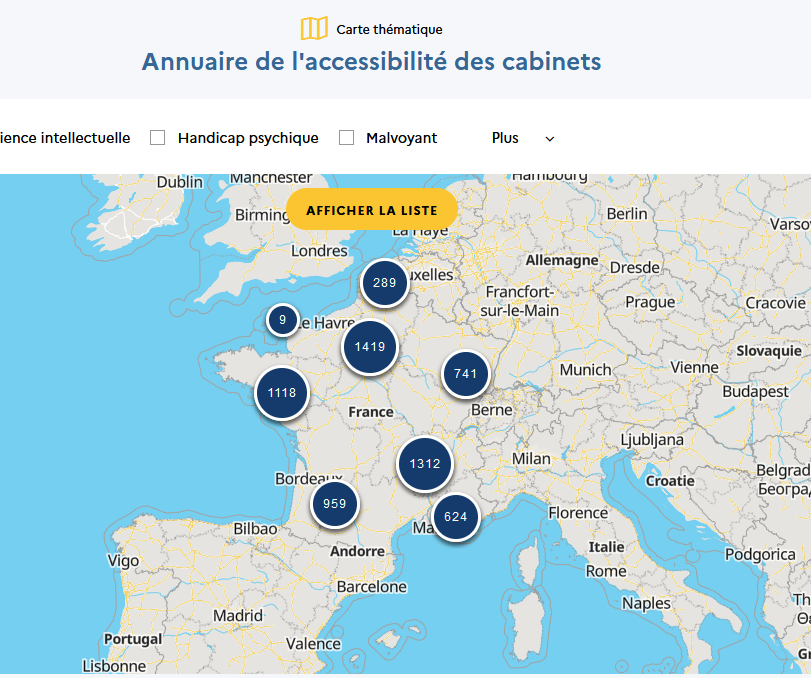 Il existe un annuaire des cabinets des Professionnels de santé avec leur accessibilité.