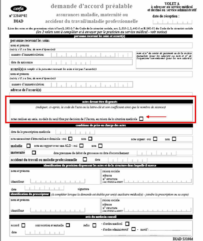 Lorsque vous réalisez une demande d’accord préalable pour des actes au-delà du seuil fixé par décision UNCAM pour les pathologies soumises à référentiel HAS, n’oubliez pas de cocher la case « décision UNCAM » et d’indiquer le nombre de séances au-delà du seuil, le code de l’acte et son coefficient.